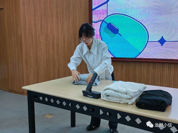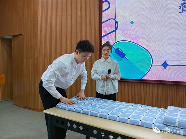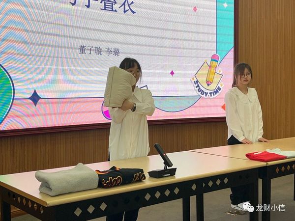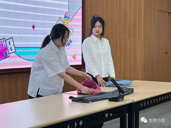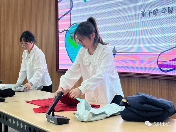 学生代表董子璇、李璐、吴婉婷、李丹和张悦分别现场展示了各类上衣和裤子的叠衣技巧,为同学们送上了自己的“整理小秘诀”。