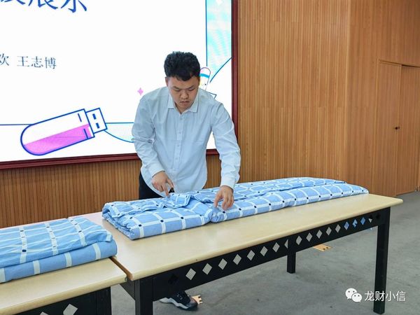 学生代表刘欢和王志博现场展示了如何快速叠好军被,并为大家传授了叠军被的一些技巧。
