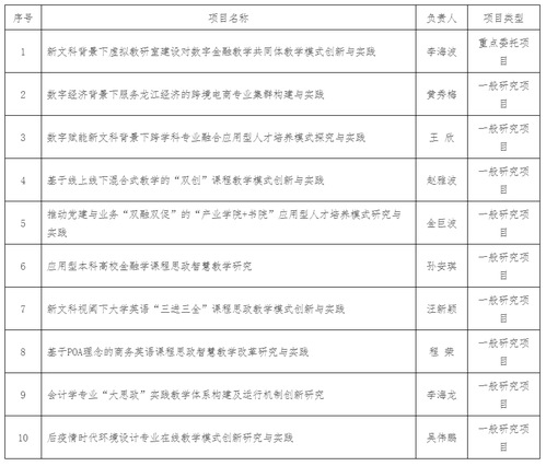 本次获批的项目聚焦“四新”建设和课程思政等前瞻性、探索性研究,对进一步深化教育教学改革具有积极的推动作用。希望各项目组积极发挥引领作用,按期开展研究工作,扎实推进项目实施。学校将加强获批项目的过程监管,稳步提高项目研究水平,切实推进教育教学创新,不断提高应用型人才培养质量。