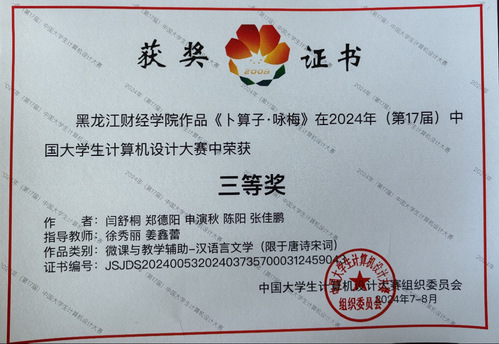为贯彻落实《国务院办公厅关于深化高等学校创新创业教育改革的实施意见》和《黑龙江省人民政府关于促进大学生创新创业的若干意见》要求,进一步深化高校教学改革,激发大学生学习计算机知识技能的兴趣和潜能,培养学生创新创业能力、团队合作意识和运用信息技术解决实际问题的综合应用能力,举办2024年(第17届)中国大学生计算机设计大赛,其中黑龙江省赛省赛设一、二、三等奖,获奖比例为参赛作品数量的10%、20%和 30%左右,我校一支队伍获得省二等奖晋级国赛,即中国大学生计算机设计大赛简称4C,该赛事是全国普通高校大学生竞赛排行榜榜单赛事之一,大赛始于2008年,是我国最早面向高校本科生的赛事之一,由教育部计算机相关教指委发起举办,大赛目的是以赛促学、以赛促教、以塞促创,为国家培养德志体美劳全面发展的创新型、复合型、应用型人才服务。大赛分设全国6个决赛赛区,全部为线下答辩方式,我校师生徐秀丽和闫舒桐、郑德阳同学参加了8月3日至7日由东北大学、中国人民大学承办的沈阳赛区“微课与教学辅助”和“数媒静态设计”赛道决赛,获得全国三等奖。