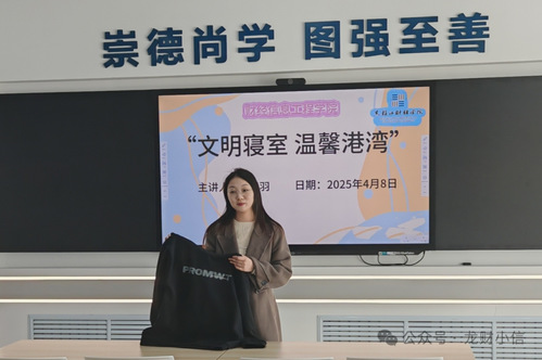 为了进一步提升我们生活空间的舒适度和文明程度,促进室友间的和谐相处,财经信息工程学院于2025年4月8日在“一站式”学生社区举行了“文明寝室,温馨港湾” 活动。本次活动由财经信息工程学院辅导员郑紫羽主讲。