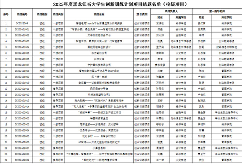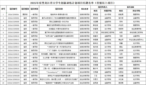 根据省教育厅《关于组织开展2025年黑龙江省大学生创新训练计划项目结题验收工作的通知》要求和《黑龙江财经学院关于大学生创新创业训练计划项目管理办法》相关规定,创业教育学院组织开展了2025年大学生创新创业训练计划项目结题验收工作。经项目负责人申报,本年度共有44个项目通过验收,其中国家级项目1项,省级项目19项,校级项目24项。现将结题项目名单予以公布: 创业教育学院 2025年7月1日