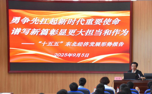 为更好的服务地方经济发展与东北振兴策略,锚定我校“地方性、应用型、开放式”的办学定位,9月5日下午,财经信息工程学院特邀辽宁省政府参事乔军教授,在尚学楼213报告厅作题为《勇于争先扛起新时代重要使命,谱写新篇彰显更大担当和作为——“十五五”东北经济发展形势报告》的专题讲座。学院党总支书记代晓霞、副院长姜海红,与学院全体教师、辅导员及各专业优秀学生代表共同聆听讲座并参与交流互动。本次讲座由副院长姜海红主持。