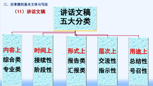 讲座内容围绕三个部分展开。第一部分聚焦公文写作应具备的基本素质与要求,强调要不断强化“六种思维”,自觉做到“五个坚持”,切实增强“四种能力”,力求提供“三类产品”,夯实写作根基。第二部分明确公文写作的基本要领与规范,包括公文的概念、形式、种类及其写作规律与关键基础。第三部分重点讲解通知、通报、报告、请示、纪要、讲话等11类常用公文文体的写作要点与实操技巧。