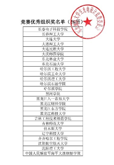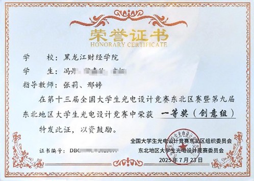 财经信息工程学院共有24支队伍参与竞赛,其中一支队伍晋级参加路演决赛,学生冯丹、倪嘉欣、安桐的作品《基于多模态光谱技术的无创哮喘实时监测系统创意设计》通过不断精进项目方案和改进实验,最终荣获创意组东北区赛一等奖路演铜杯。除此之外,财信学院在第十届省赛中有10支队伍获创意赛省二等奖的好成绩。我校也被授予第十三届全国大学生光电设计竞赛(东北赛区)“竞赛优秀组织奖”。